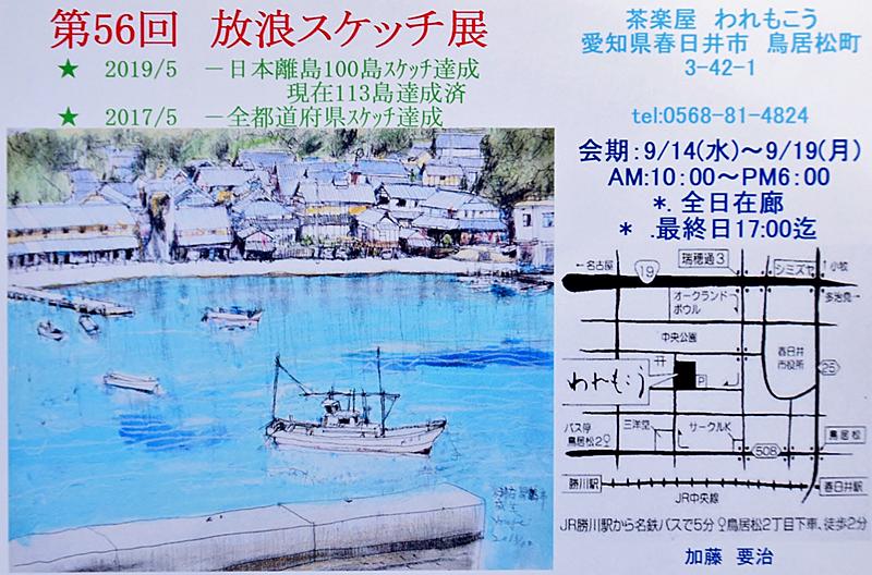「第56回 放浪スケッチ展」のご案内 ★ 9/14(水)〜9/19(月) AM10:00〜PM6:00 ★ 茶楽家 われもこう (愛知県 春日井市) *. 全日在廊します (アクセス)・・・MAP参照 ◎ 車・・・・駐車場有 ◎ 一般交通機関 JR名古屋駅⇒勝川駅(18分) ☆7分間隔 勝川駅からは。。。タクシーor名鉄バス タクシー:勝川駅前に常時待機(5分で着) バス :@番乗り場着のバスに乗車し、 「鳥居松二丁目」下車2分