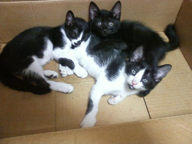 生後2ヶ月半になる黒1匹と黒白2匹で、3匹ともオスの子猫たちの里親を募集しています。
