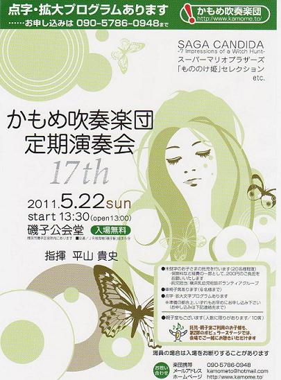 ●日時 2011年5月15日(日) 13:30開場 14:00開演 ●場所 鎌倉芸術館 大ホール ●曲目 クライズ・オブ・ロンドン /M.エレビー アンパリト・ロカ /J.テキシドール/A.ウィンター編 南風のマーチ(2011年吹奏楽コンクール課題曲) /渡口公康 丘の上のレイラ /星出尚史 朝鮮民謡の主題による変奏曲 /J.B.チャンス アルセナール /J.ヴァンデルロースト 詩的間奏曲 /J.バーンズ ファゴット協奏曲変ロ長調K.191より /W.A.モーツァルト/M.コニンクス編 独奏:浅原慎之輔(当団団員) ●指揮 西野明男 ●入場料 全席自由500円 ●チケット取り扱い ヤマハ藤沢ショップ 有隣堂藤沢ミュージックショップ 鎌倉芸術館1Fインフォメーション ●お問い合わせ Mail rc@grandship.com(@を半角に変えてください) TEL 080-2333-4643(浅原) HP http://www.grandship.com ※東日本大震災に対する復興支援のため、 新曲を発表したP.スパークの作品「陽はまた昇る」の演奏と 日本赤十字社への募金活動を行います。 ※東日本大震災の影響に伴う会場等の都合により、 公演を中止や延期する場合がございます。 最新情報は公式HPにてご案内いたします。