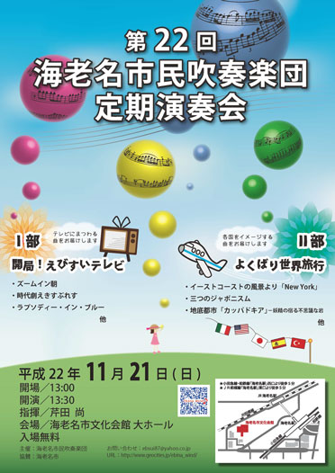 厚木市、海老名市を中心に活動しております「アレグレスウィンドオーケストラ」と申します。 この度、「第5回定期演奏会」を下記の通り開催いたしますので、 この場をお借りしてご案内させていただきます。 皆様のお越しを、団員一同心よりお待ちしております。 『アレグレスウィンドオーケストラ 第5回定期演奏会』 ♪日時 :2010年11月13日(土) 開場 15:30 開演 16:00 ♪会場 :海老名市文化会館 小ホール 【入場無料】 (小田急小田原線・相鉄線「海老名駅」西口より徒歩5分 JR相模線「海老名駅」東口より徒歩5分)