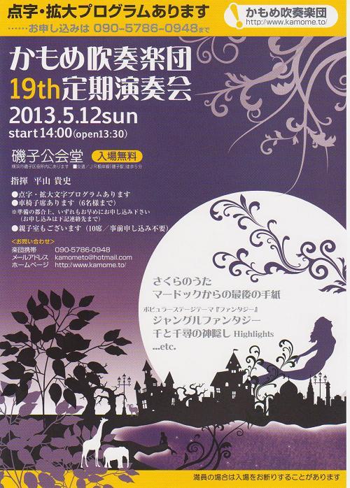 入場料:無料 プログラム:火の鳥(I.ストラヴィンスキー) 2013年吹奏楽コンクール課題曲より エル カミーノ レアル(A.リード) ミュージカル特集 レ・ミゼラブル など 他