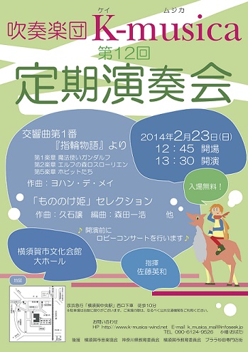 《日 時》2014年2月16日(日) 開場 14:00 開演 14:30 《会 場》川崎市多摩市民館大ホール (JR南武線「登戸駅」より徒歩10分・ 小田急線「向ヶ丘遊園」北口より徒歩5分) 《入場料》 入場無料・全席自由 《指揮者》 大平博之・佐藤一大 《曲 目》 ♪第一部 ♪ ・キャンディード序曲 ・おもちゃの兵隊のマーチ ・展覧会の絵より「プロムナード」、「キエフの大門」、他 ♪第二部♪ ・「英雄の証」モンスターハンターより ・ジャパニーズグラフィティーX ・魔女の宅急便コレクション 、他